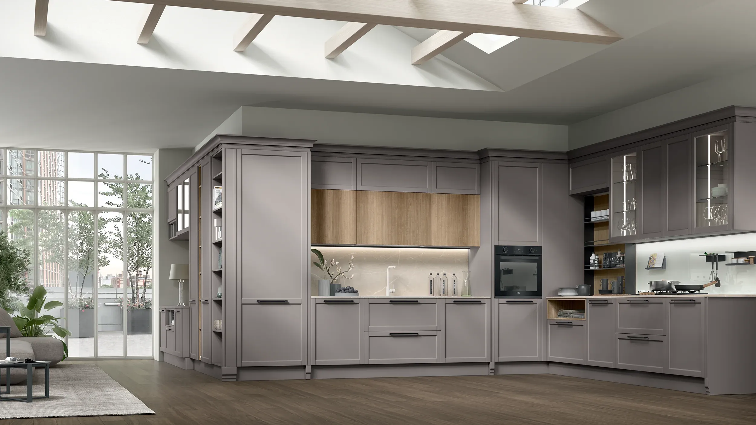 클래식한 디테일과 섬세한 색감이 질감의 깊이와 감각적인 촉감으로 이어지며, 전통과 모던함이 완벽한 조화를 이루는 주방 겸 거실 제안이다.