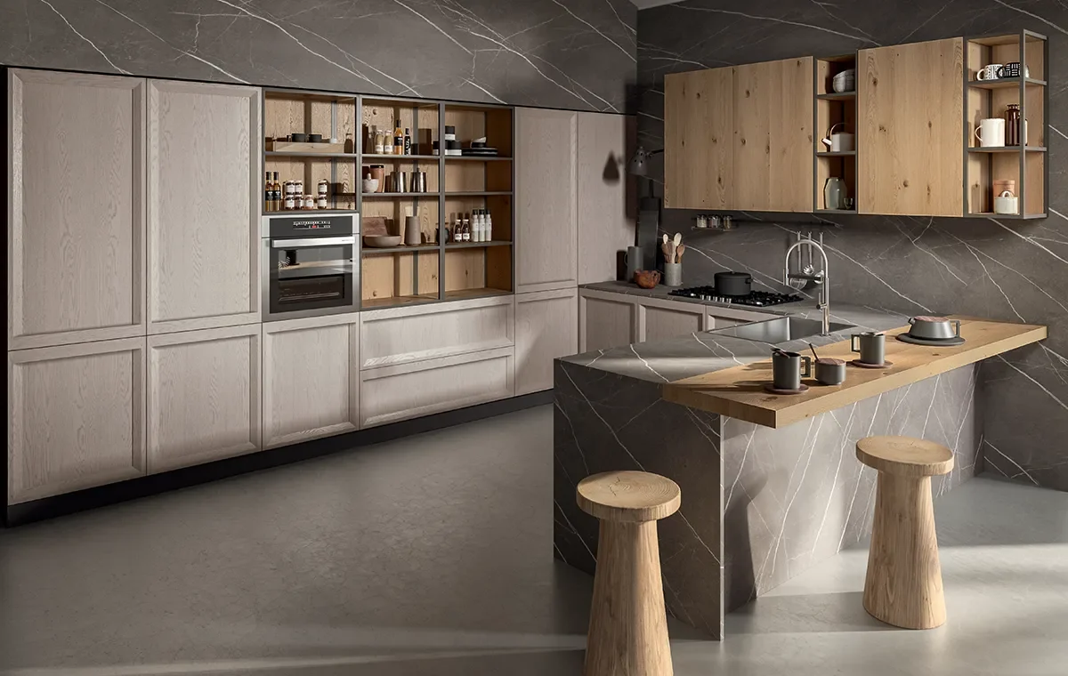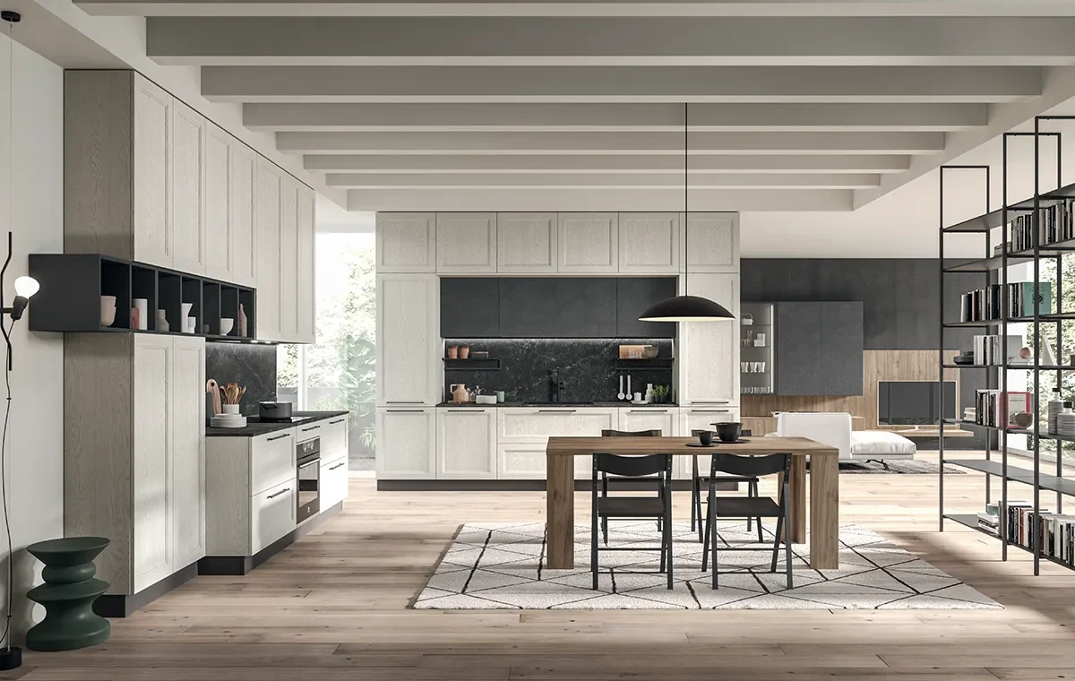 첨단 디자인과 변치 않는 실용성이 결합된 이 주방은 자연스러운 흐름과 사교적인 분위기가 특징인 현대 주거 공간의 중심이 되는 핵심 공간입니다.