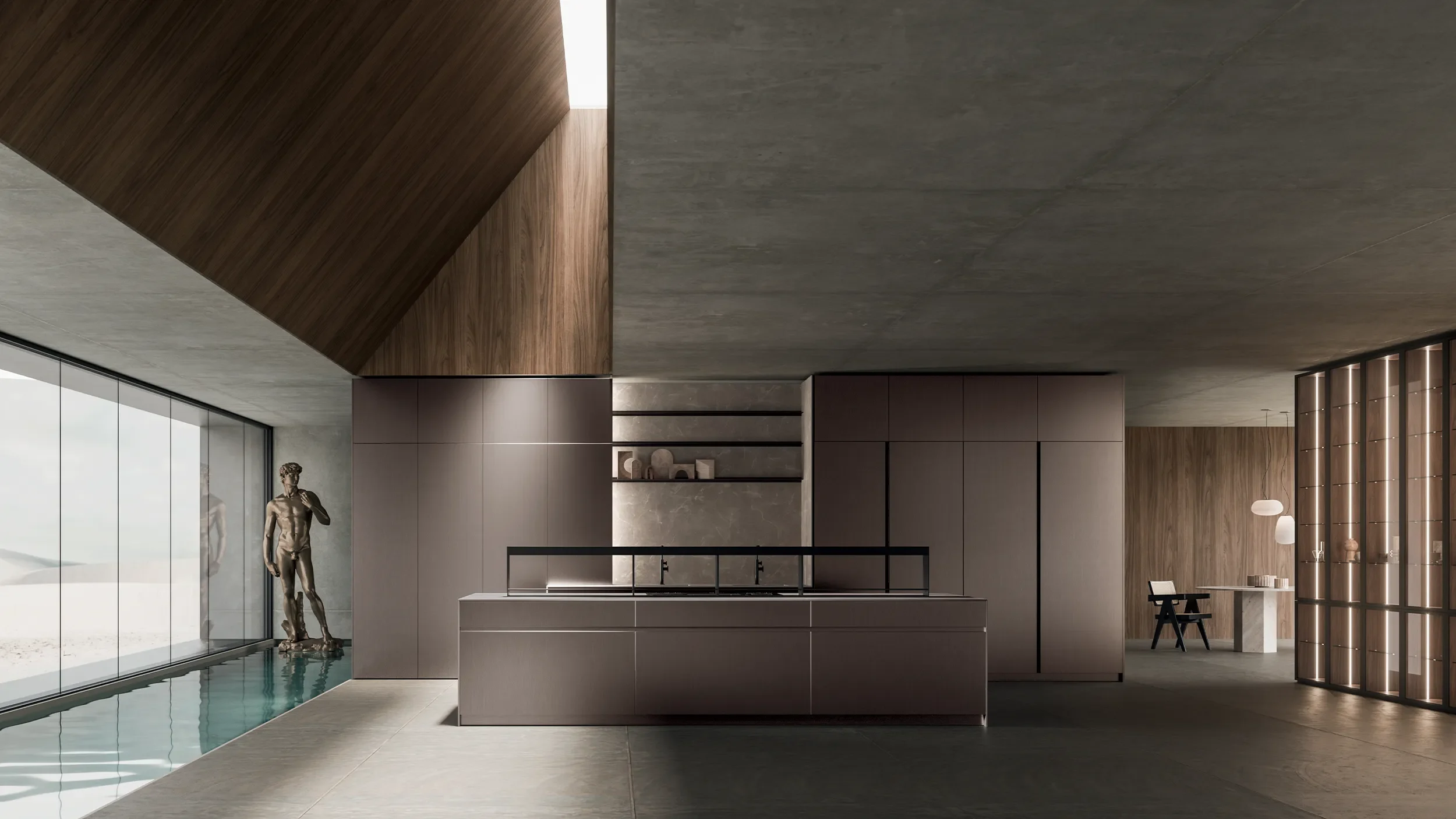 아일랜드와 키큰장의 도어는 특수 도장된 Rigato Metal Bronzo 마감을 적용하였고 상판은 고급대리석의 표면과 질감을 지닌 HPL 을 사용하였습니다.