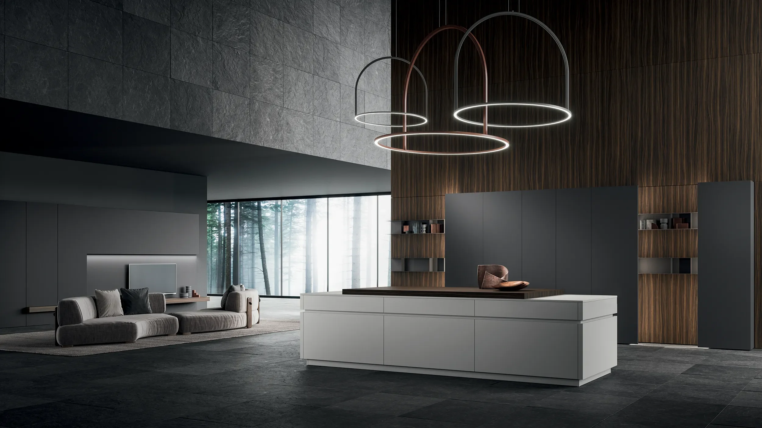 Matt Lacquered Kashmir Efeso 마감의 중앙 아일랜드와 Matt Lacquered Kashmir Piombo 마감의 키큰장이 하나의 균형 잡힌 톤으로 어우러집니다. 거실 가구 전면에도 동일한 마감을 적용해공간 전체에 자연스러운 연속성과 조화를 부여했습니다.