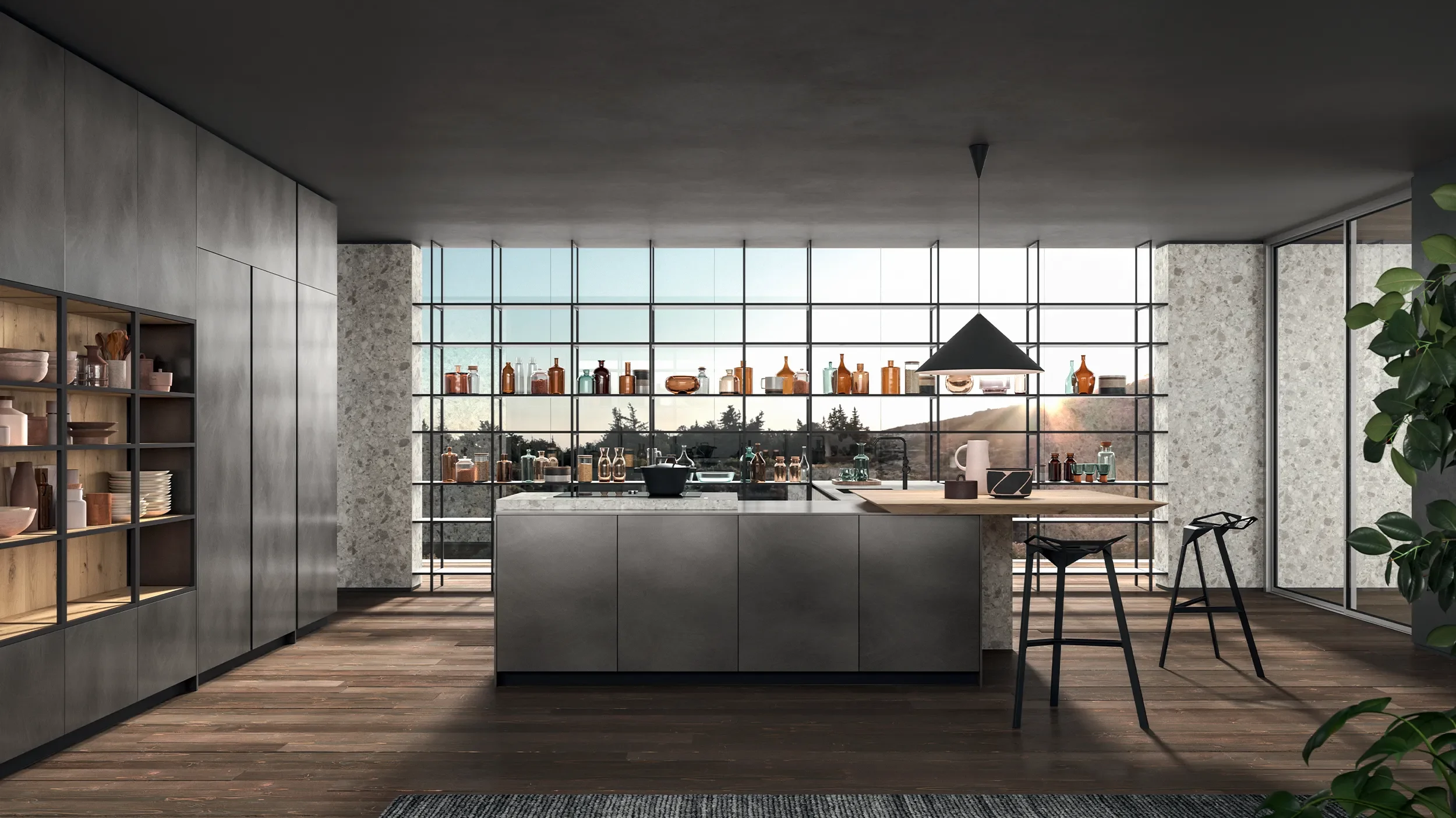 SP.22 무광 도장 키큰장은 은은한 메탈릭 효과로 마감되어, 아일랜드 조리 구역 하부장과 동일한 피니시로 통일감을 이룹니다. 세척 구역의 하부장 역시 SP.22 모델이 적용되었으며, 유니컬러 카네 (Unicolor Kanè) 엣지 마감의 HPL 소재로 제작되어 견고하면서도 세련된 인상을 줍니다. 이 하부장과 조화를 이루는 상판은 스트림 HPL 라미네이트로 마감되어, 순수한 형태감이 돋보이는 단단한 구조를 완성합니다. 리빙 공간에서는 투또레뇨(Tuttolegno) 크루드 스플릿 너티드 오크(Crude Split Knotted Oak) 베니어의 벽걸이형 하부장이 사용되어, 자연목의 질감이 주는 따뜻함을 더합니다.이 동일한 원목은 카운터와 컬럼 시스템 내부의 메탈 요소(Vertigo) 패널에도 사용되어, 공간 전반에 소재의 통일성과 리듬감을 부여합니다.