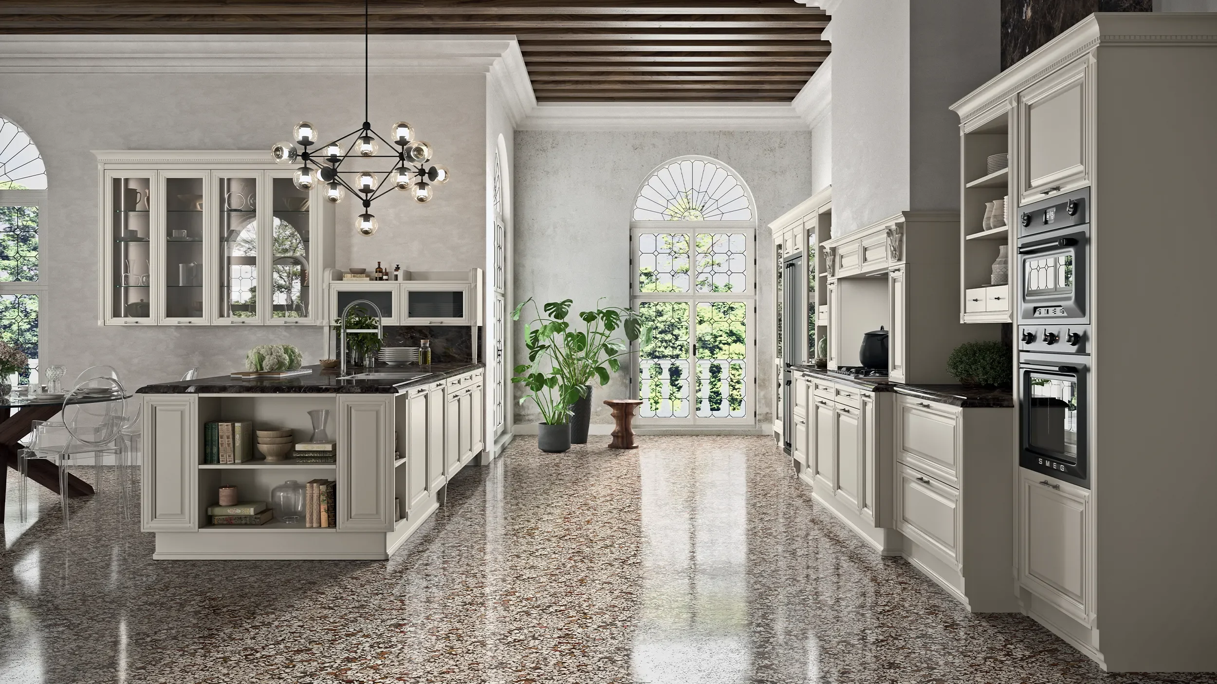 The Royal lacquered hood, which matches the kitchen’s colours, stands out for the Corinthian capitals on the front: decoration with great visual impact.