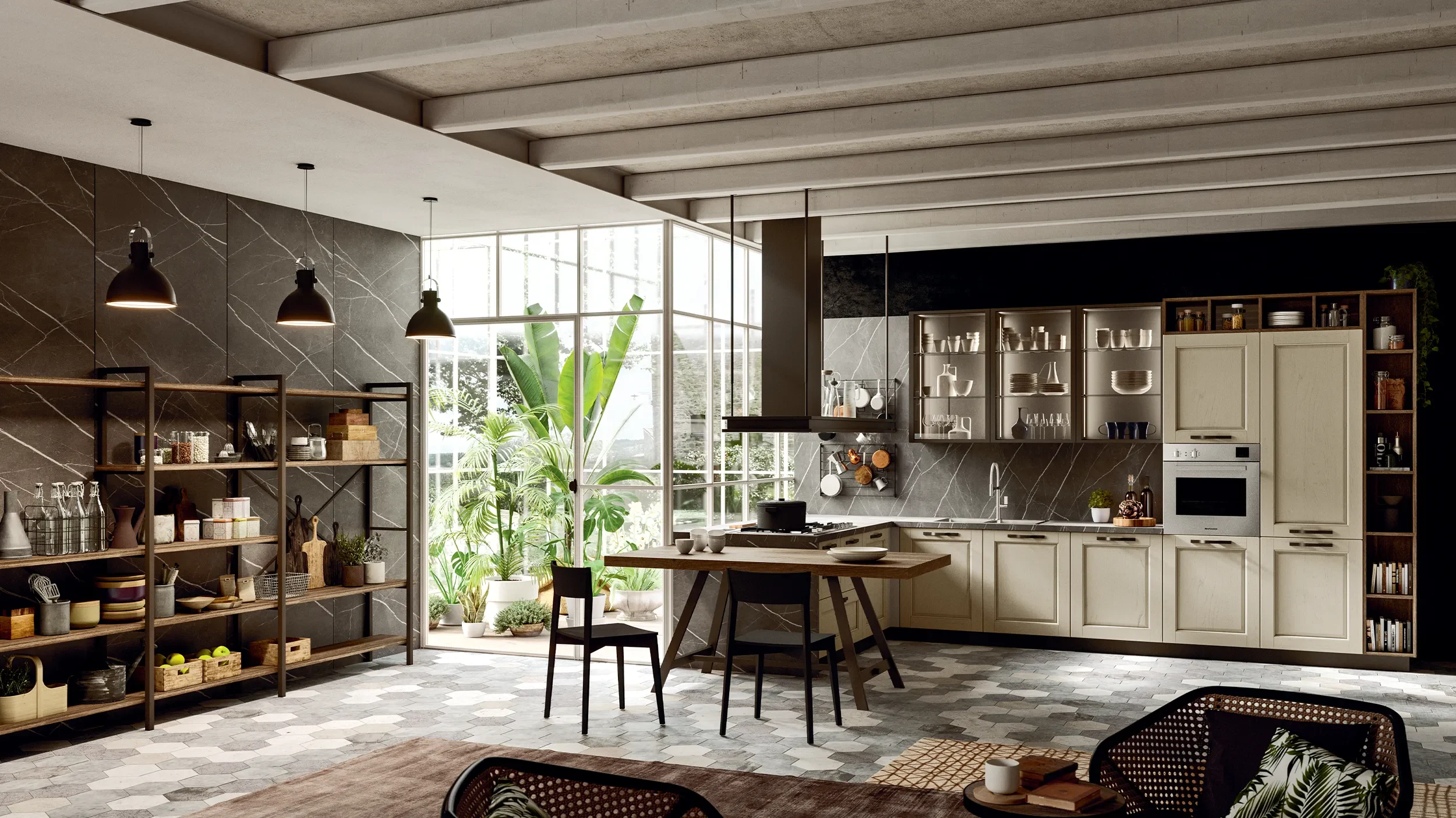 160x80cm 및 180x90cm 두 가지 사이즈로 제공되는 인더스트리얼 테이블(Industrial Table) 은 메탈 베이스와 두께 6cm 또는 10cm의 폴딩 상판으로 구성되어 있습니다. 상판과 벽면 패널(백스플래시)은 HPL 아키타(Akita) 소재의 유니컬러 엣지(Unicolor Edge) 마감으로 선택되어, 견고하면서도 세련된 질감을 완성합니다. 강렬한 존재감을 지닌 인더스트리얼 핸들, 플린스(Plinth), 그리고 길이 180cm의 인더스트리얼 아일랜드 후드가 동일한 마감으로 조화를 이루며 전체 디자인의 완성도를 높입니다.