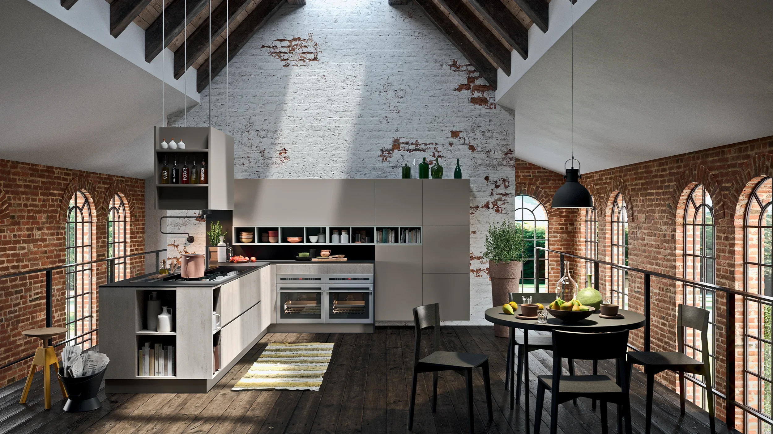 Peninsula형 구성으로 완성된 이 주방은 캐비닛에 적용된 테라노바(TERRANOVA) 솔리드 컬러의 실크 같은 질감이 특징이며, 와일드 아르티코(WILD ARTICO) 우드 마감과 조화를 이루어 부드럽고 세련된 분위기를 자아냅니다. 콤비 플랫 그루브 핸들(Combi Flat Groove Handle) 과 플린스(Plinth)는 토르토라(Tortora) 락카 마감으로 마무리되어, 주방 전체를 하나의 조화로운 톤으로 연결합니다.