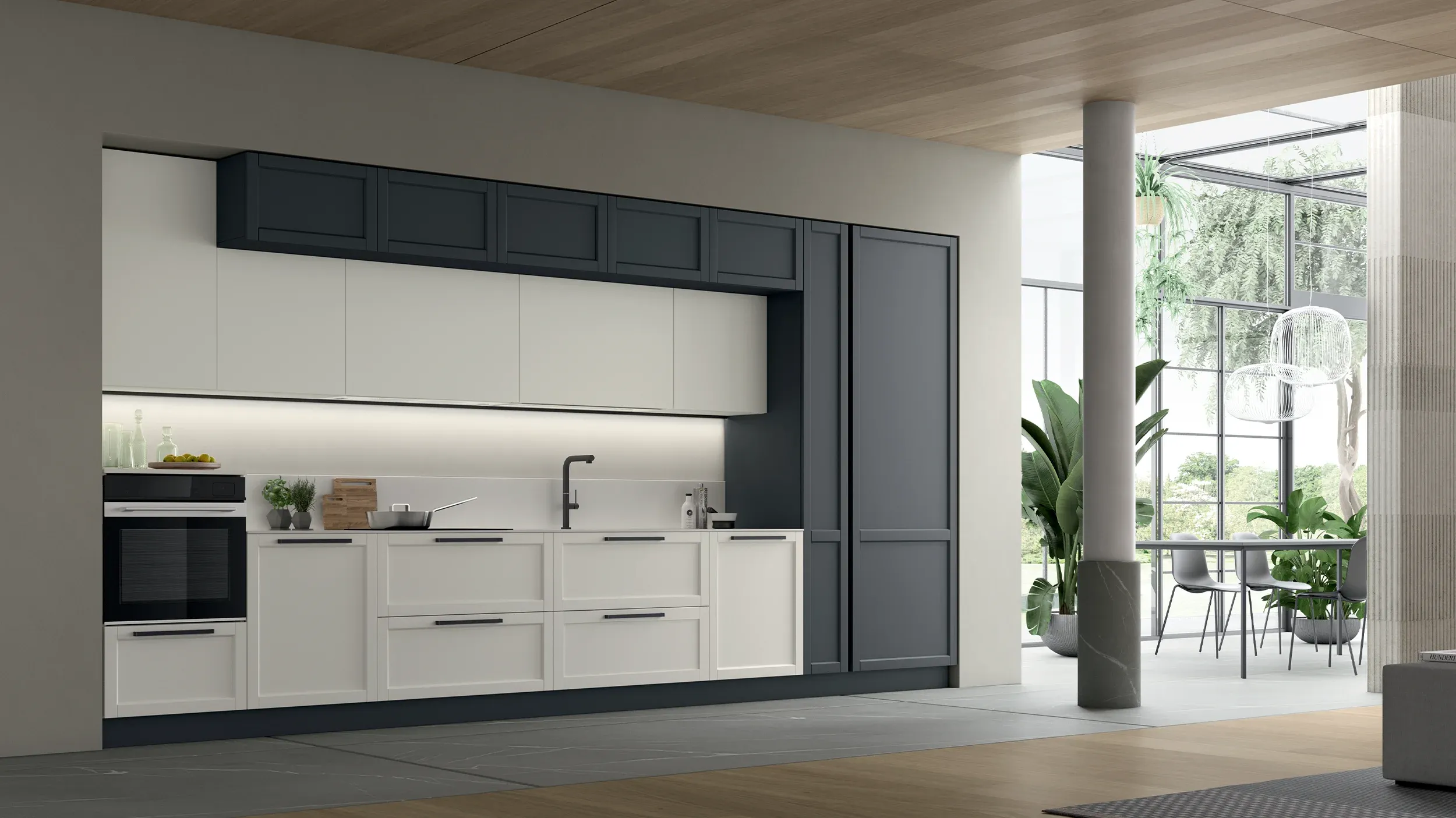 대비의 미학을 강조한 구성으로, 밝고 어두운 색조가 조화를 이루며 클래식한 프레임 도어의 개념을 현대적 디자인의 미니멀한 라인과 결합합니다. 서로 다른 요소가 만들어내는 매혹적인 균형 속에서, 미적이고 구조적인 조화가 완성됩니다.