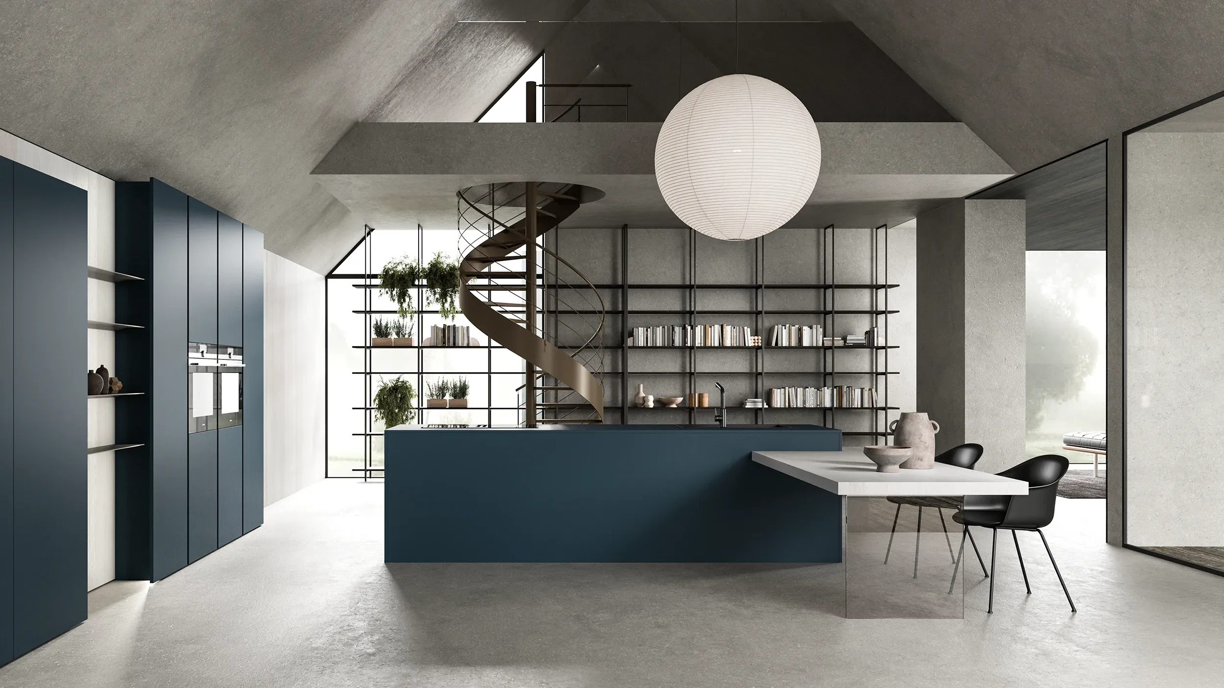 중앙 아일랜드, 상판, 그리고 벽면 니치에 배치된 컬럼 유닛은 모두 HPL Fenix NTM BLOOM BLU SHABA 마감으로 구성되어 있습니다. 전면 개폐는 브론즈 톤의 착탈식 Gola 손잡이를 통해 이루어지며, 동일한 마감이 Plinth 에도 적용되어 전체적인 통일감을 더합니다.