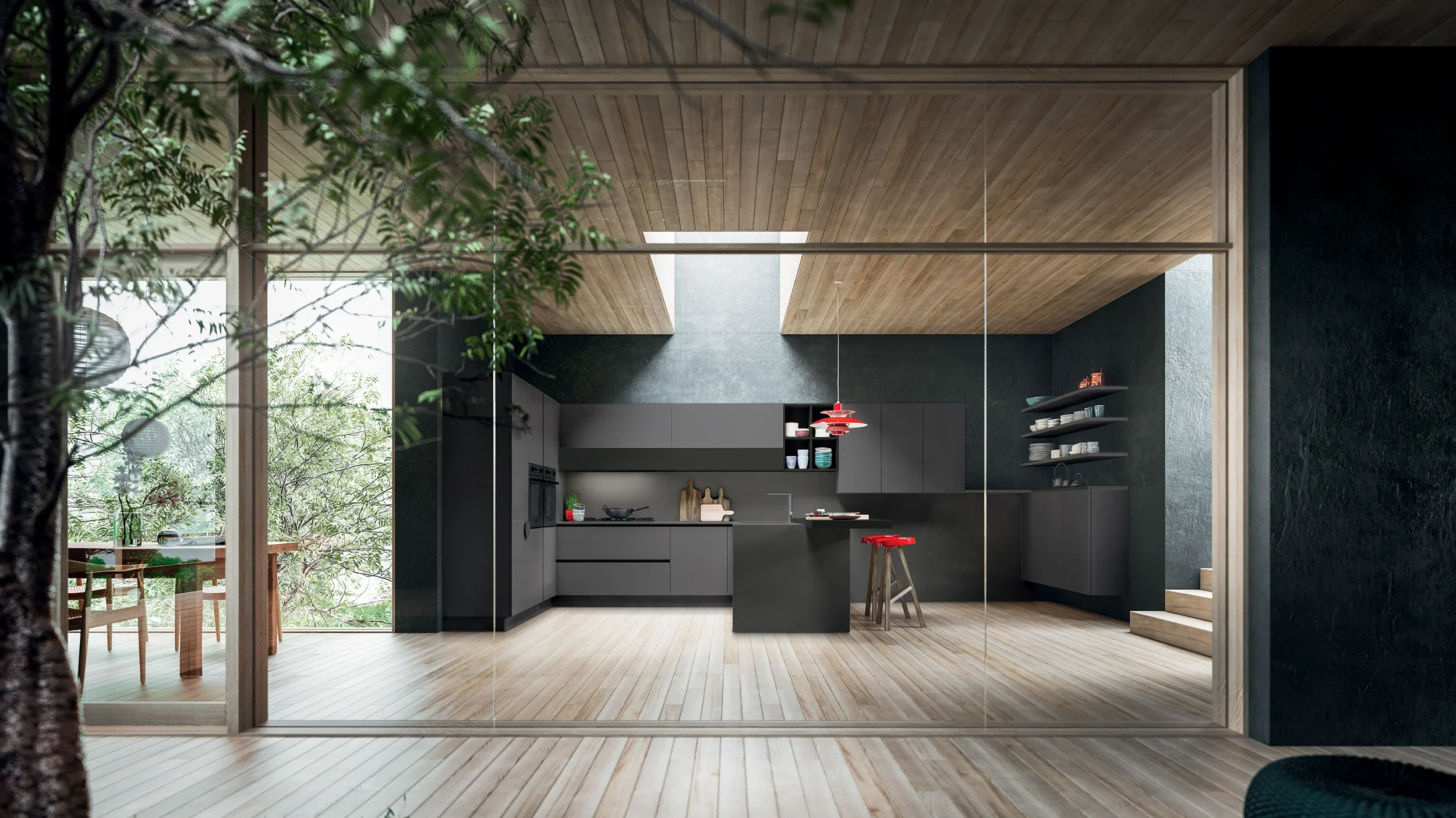 24cm 높이로 설계된 ‘Fat’ 후드 유닛은 다른 월 유닛보다 깊게 제작되어 주방 전체에 강렬한 수평적 균형감을 부여합니다. 도어는 피닉스 네로 잉고 마감으로, 전체 구성을 이루는 매트 앤트러사이트 락카와 완벽한 조화를 이룹니다.