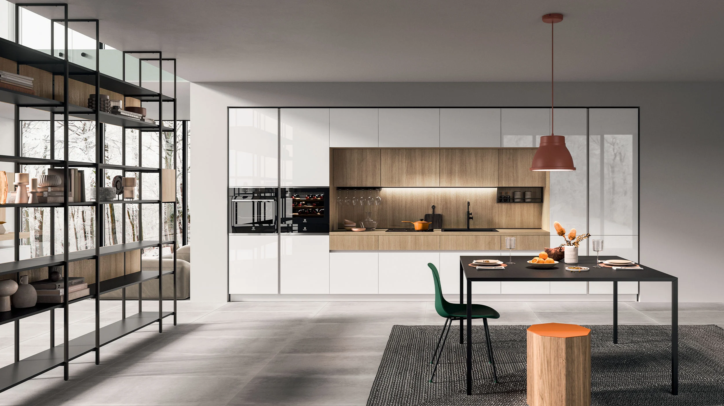 키큰장, 하부장, 캔틸레버 월유닛은 유광 도장 마감의 Lux Bianco Kos 도어로 구성됩니다. 화이트 컬러의 탈착형 입체 그루브로 개폐되며, Thermostructured Oak Gold로 마감된 첫 번째 서랍이 상판과 월유닛으로 자연스럽게 이어져 소재의 연속성을 완성합니다. 138x138cm 사이즈의 슬림 스퀘어 테이블은 메탈 그레이 마감의 슬림 메탈 구조로 제작되었으며, 블랙 프레임과 짙은 그린 컬러의 마니 체어가 공간의 포인트가 됩니다. 천장과 바닥을 잇는 책장형 파티션 구조가 공간을 시각적으로 구분하면서도, 개방감과 우아함을 동시에 유지합니다.