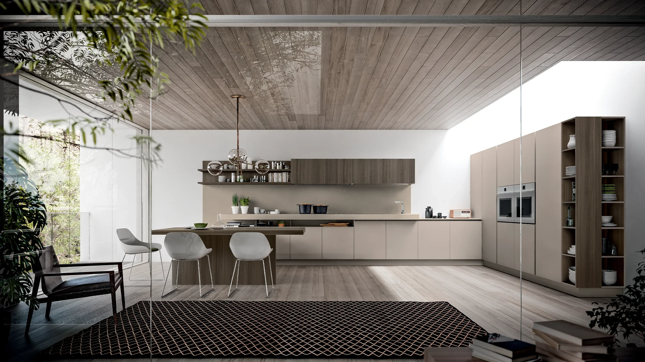 이 주방은 두 가지 높이로 공간을 구성해 기능성과 동선을 세련되게 분리합니다. 낮은 레벨에는 써모스트럭처드 라미네이트 소재의 실용적인 다이닝 테이블이 배치되어 있으며, 같은 높이의 반도는 집 안의 두 영역을 자연스럽게 구분하는 완벽한 경계 역할을 합니다. 그보다 높은 레벨에는 두꺼운 상판 위에 쿡탑과 싱크가 배치되어, 조리 공간에 안정감과 건축적인 깊이를 더합니다.