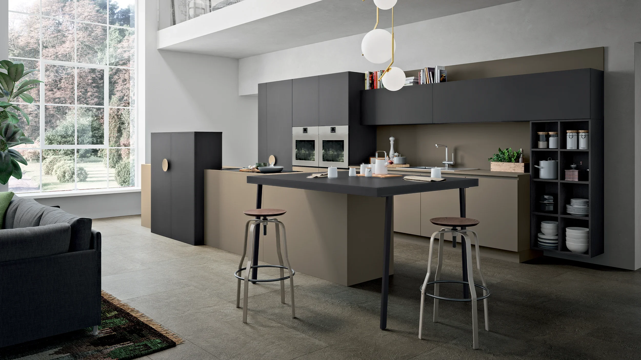중앙 아일랜드는 matt Ottawa 도장 마감의 모놀리식 구조로 이루어져 있으며, 동일한 색상의 Ottawa castor brown Fenix 상판으로 마감되어 있습니다.