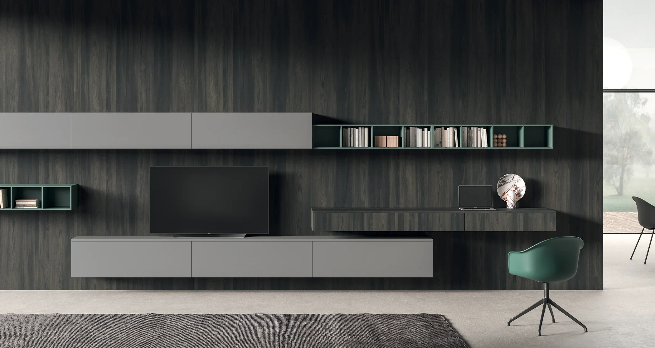 가로와 세로로 구성된 세련된 거실 가구와 북케이스는 깔끔한 라인과 균형 잡힌 디자인으로 우아함과 편안함을 더하고, 공간에 개성과 생동감을 불어넣습니다.