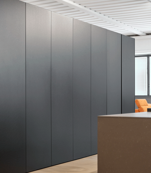 완전히 통합된 기술을 기반으로 한 이 슬라이딩 포켓 도어 시스템은 사용 시에는 공간을 열어 적극적으로 활용하게 하고, 필요할 때는 다시 감춰 매끄럽게 정돈할 수 있게 합니다.
