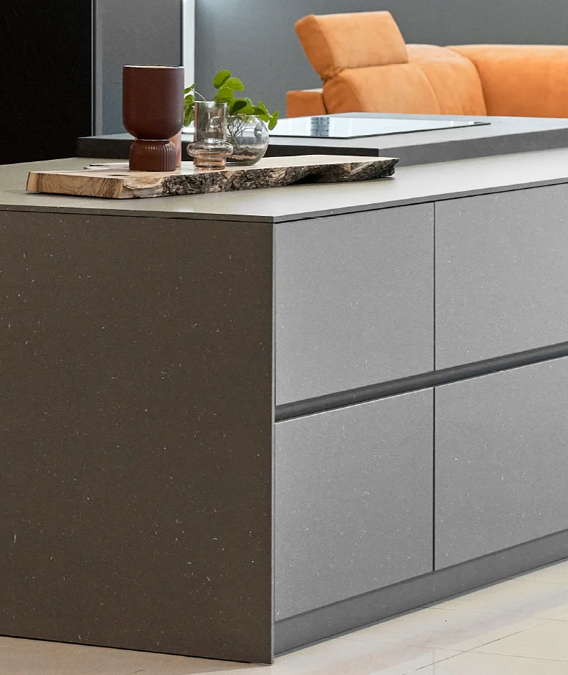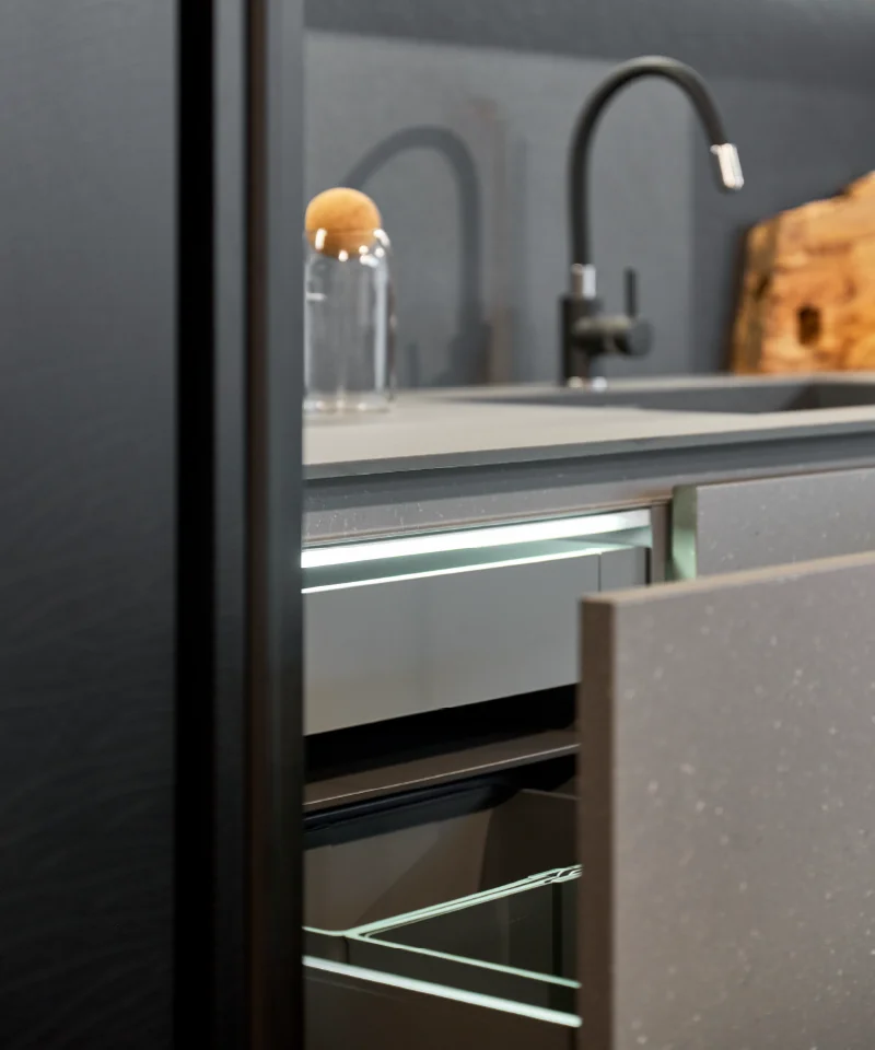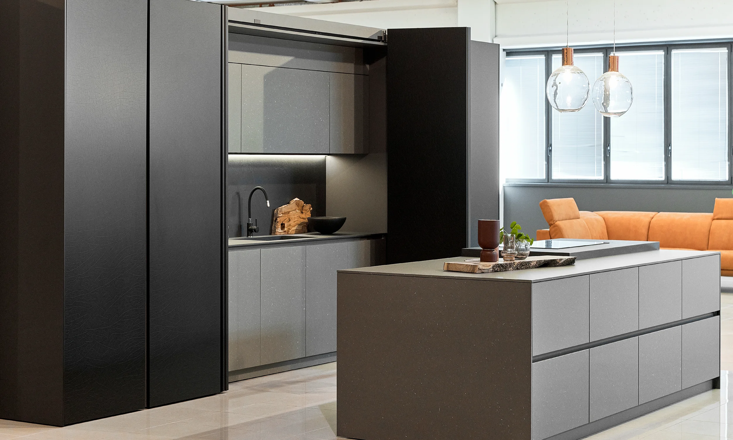 컬럼 전면은 블랙 Krekrelle 래커, 베이스 유닛은 다크 스톤 래커로 마감되었습니다. 상판은 통합형 싱크가 포함된 블랙 스톤 HPL 라미네이트로 구성되어 있습니다.