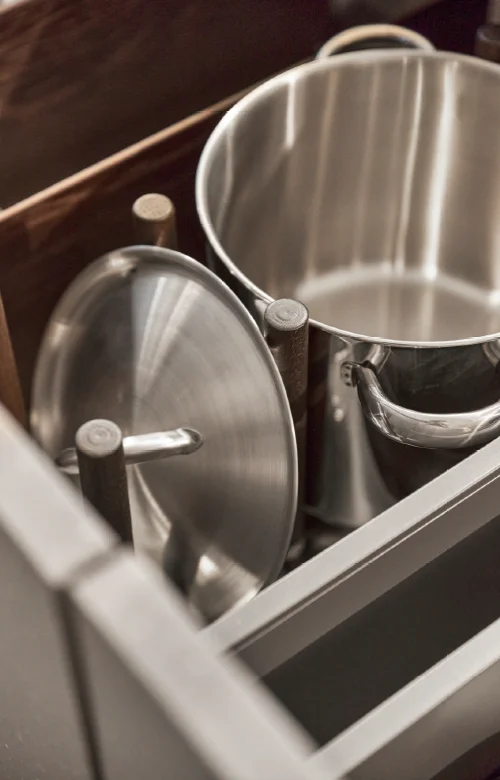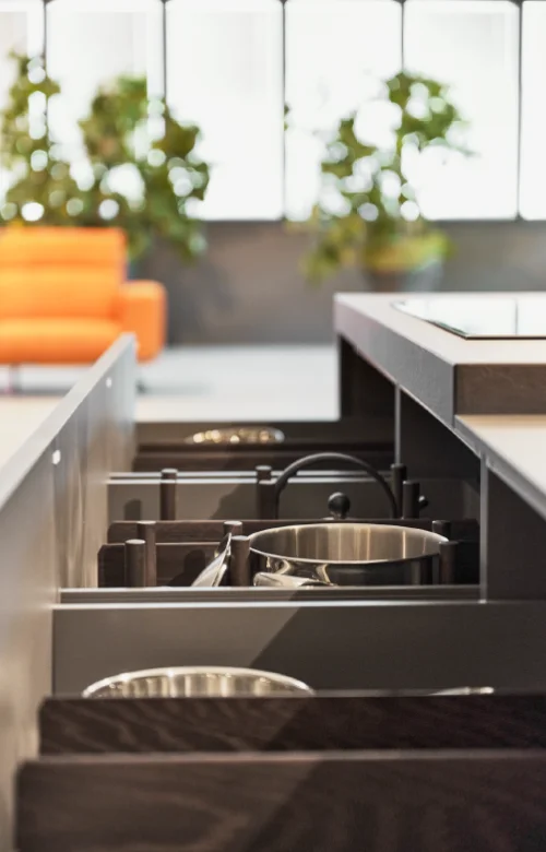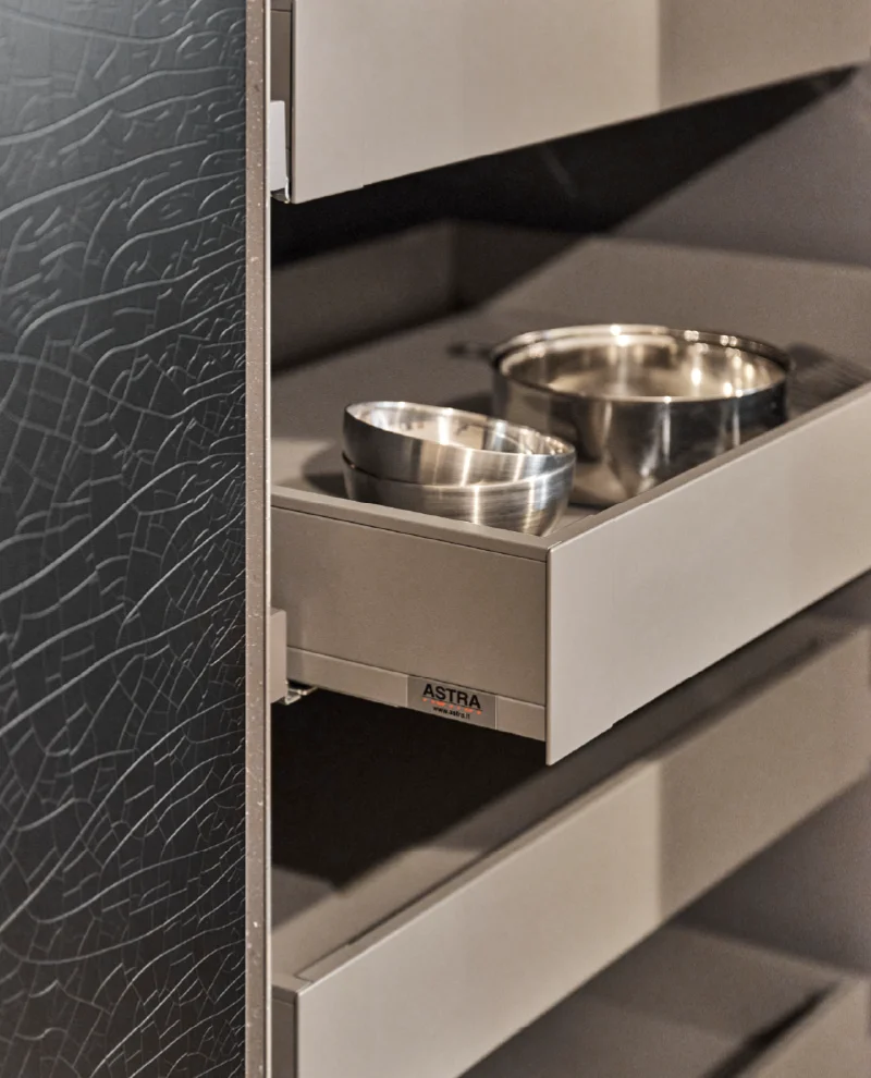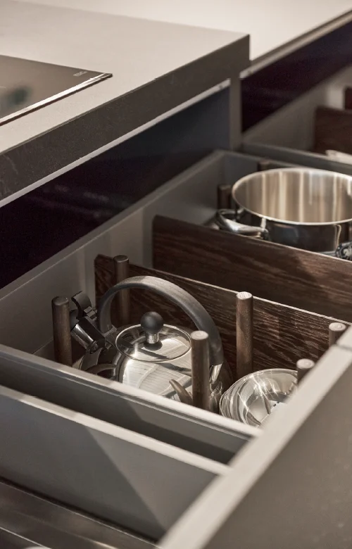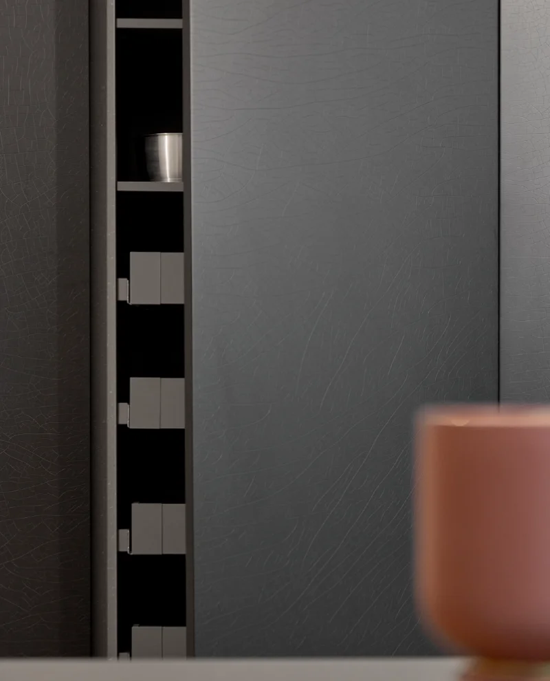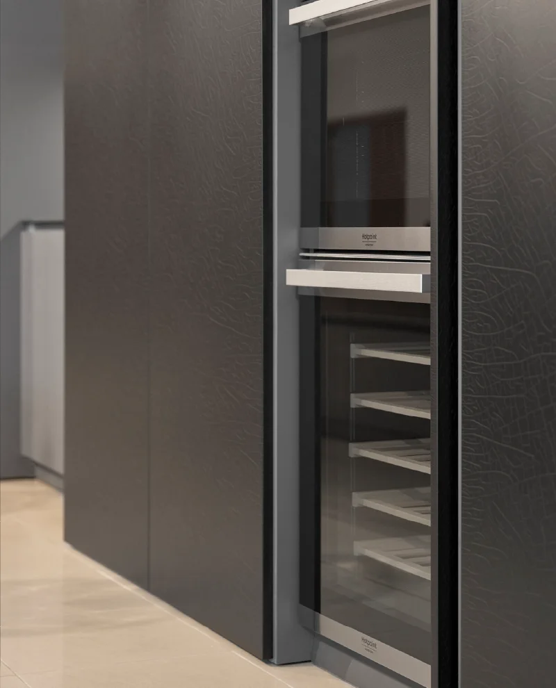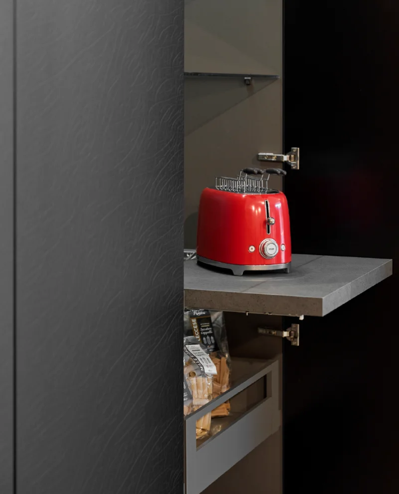 주방의 작업 공간은 간편하게 접근할 수 있으며, 닫을 때는 도어를 가볍게 밀어주기만 해도 전체 공간이 우아하게 숨겨집니다.