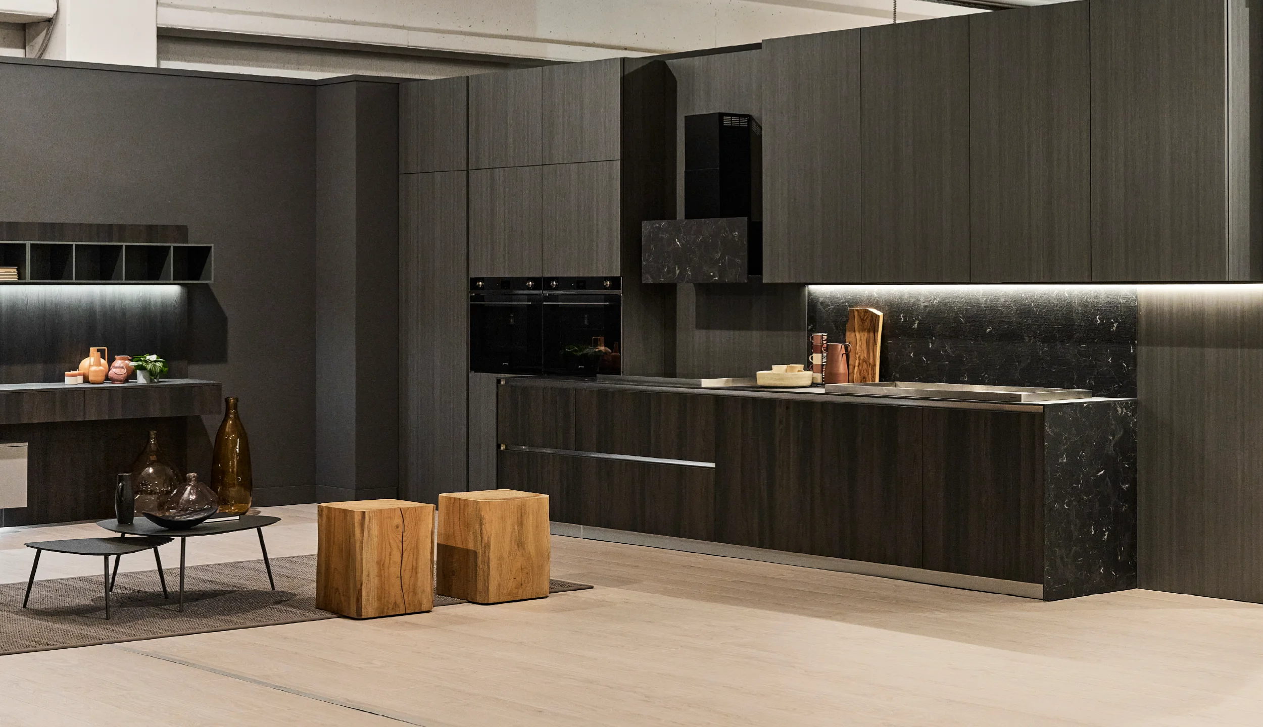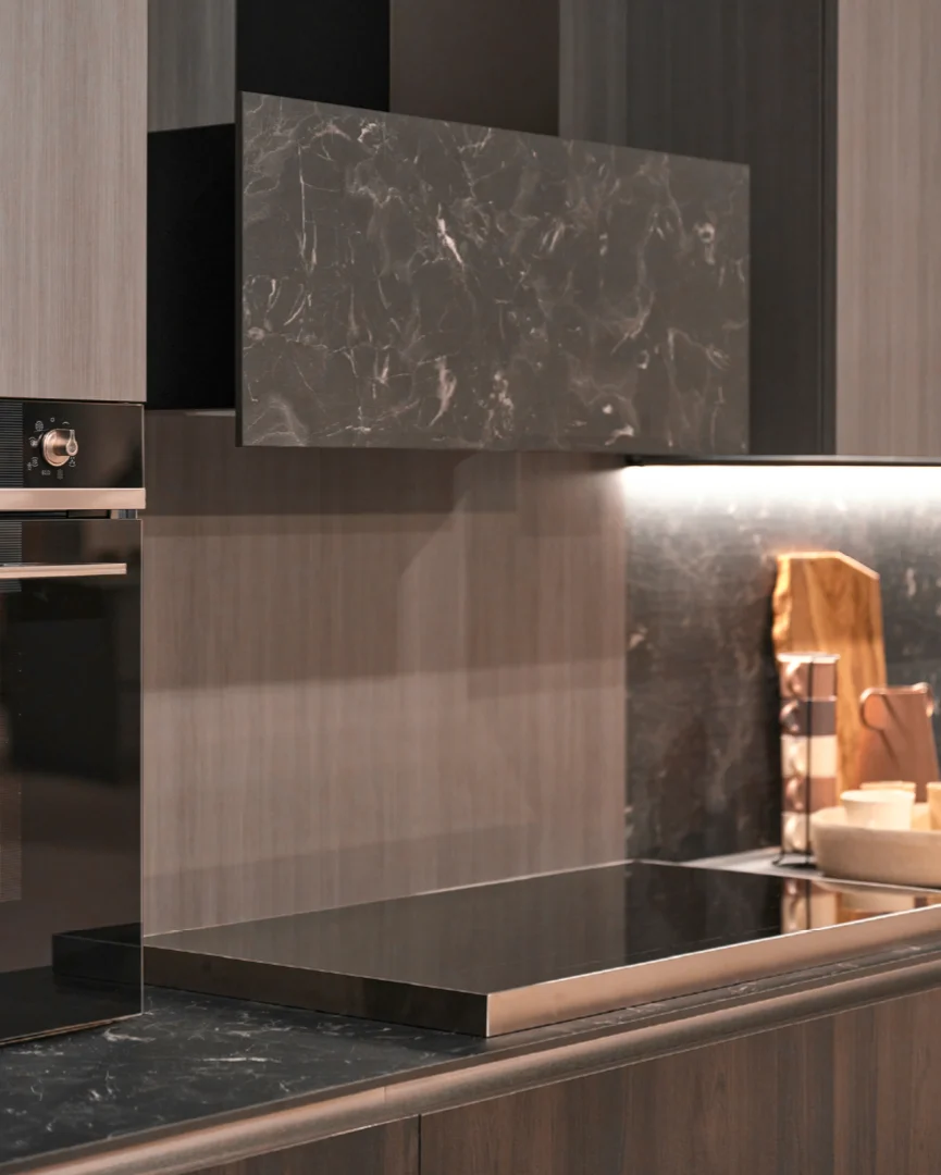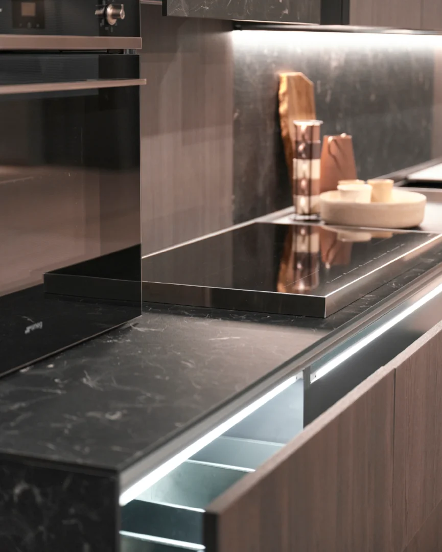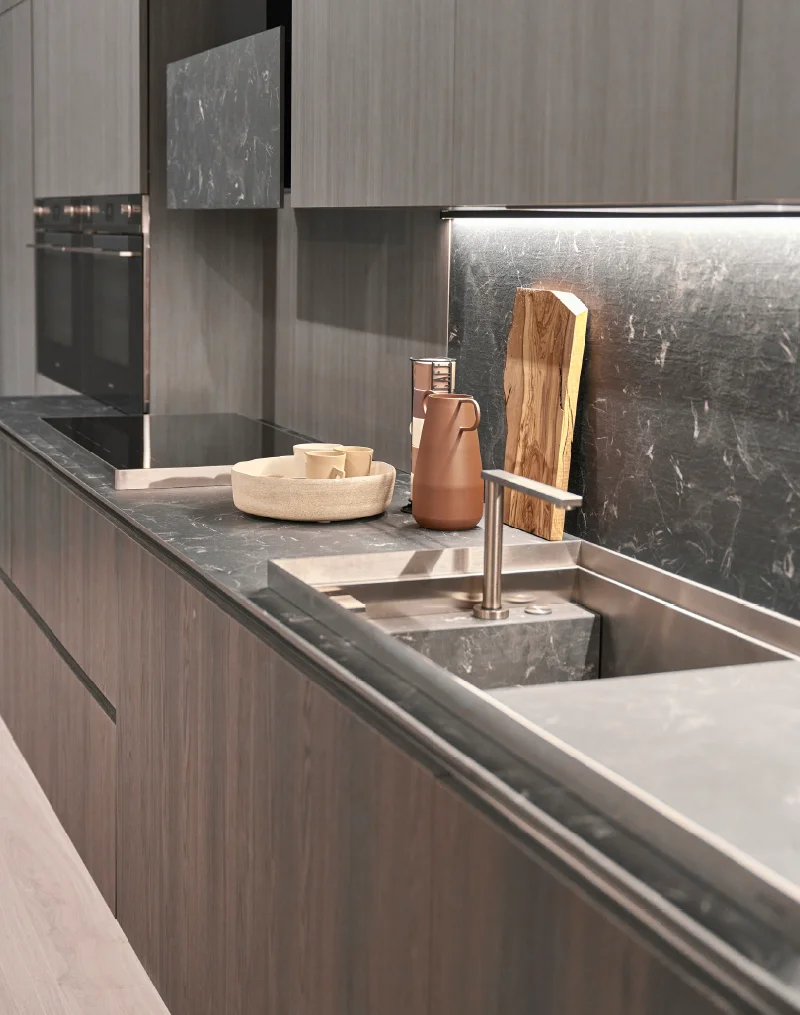 컬럼 전면과 월 유닛은 Metal stainless steel 라미네이트 베이스 유닛은 noir oak 라미네이트로 마감되었다. 워크탑은 empire black HPL 라미네이트로 제작되어 Barazza의 Mizu Kasai 라인의 쿡탑과 싱크를 품고 있다.가장 진보된 디자인은 새로운 미적·기능적 요구를 대변하는 언어가 된다.Mizu Kasai 컬렉션의 싱크는 탁월한 품질과 혁신성으로 돋보이며, Kasai 쿡탑은 싱크와 완벽한 조화를 이루어, 스틸 프레임과 동일한 규격의 외곽선을 유지함으로써 균형 잡히고 조화로운 주방 구성을 완성한다.