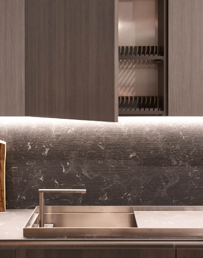 75cm 폭의 도어 전면이 이 주방의 구성을 완성합니다.사용의 편리함과 실용성을 동시에 갖춘 디자인으로, 식기세척기 옆 75cm 모듈에는 세제를 보관할 수 있는 오픈 수납공간이 배치되어 있습니다. 오픈 유닛 내부에는 텐션 구조물이 적용되어 도어를 여닫을 때 전면이 안정적으로 유지되며, 견고하고 정제된 움직임을 제공합니다.