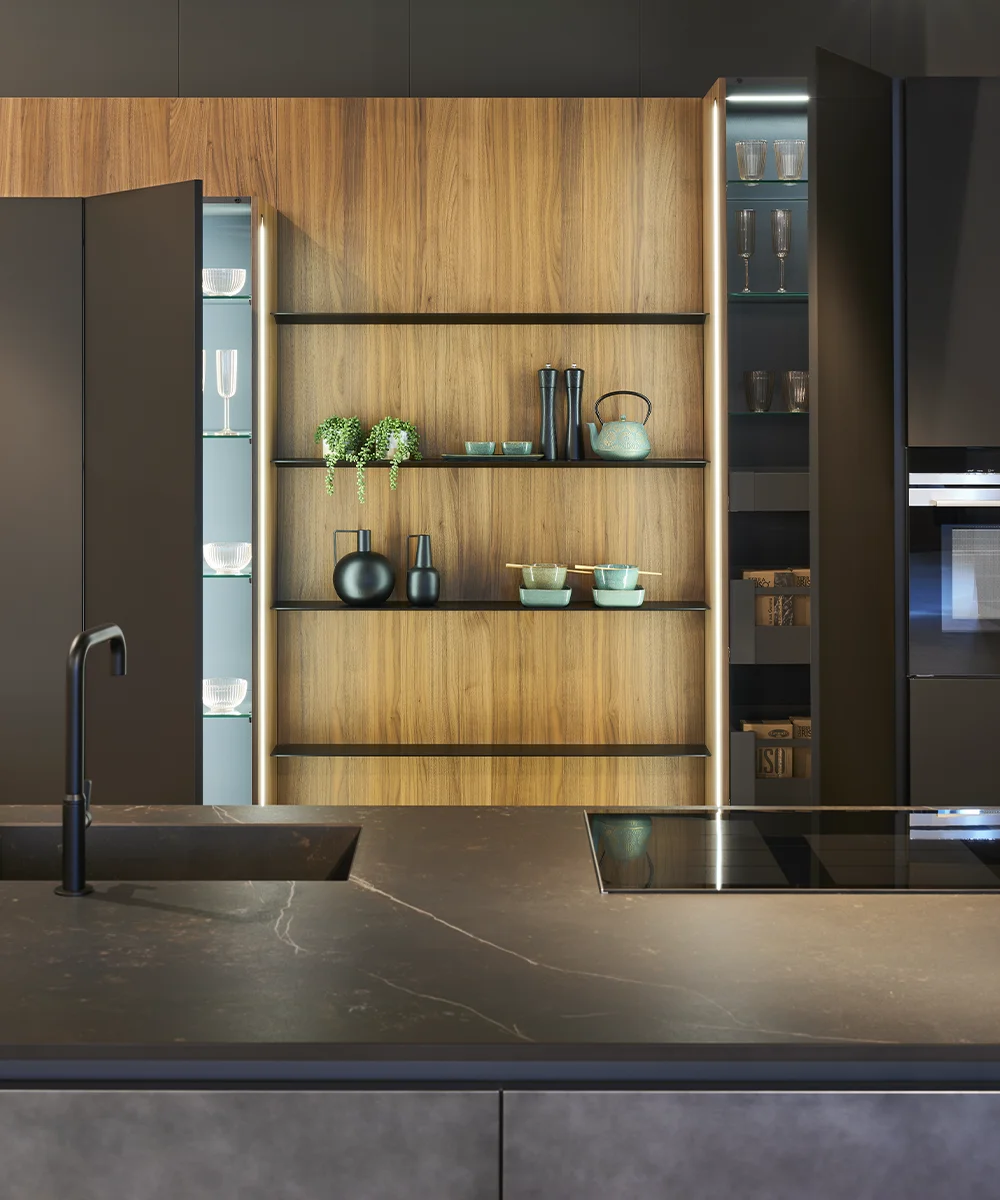 키큰장 그룹은 서로 다른 높이의 두 개의 순수한 볼륨(pure volumes)으로 구성되어 있으며, 바닥까지 이어지는 도어(doors to the ground)가 적용되어 안정감 있는 수직 라인을 형성합니다. 두 볼륨은 flamed Brianza Walnut veneer의 우아한 boiserie로 연결되고, 그 위를 가로지르는 burnished metal Slim shelf가 공간에 섬세한 리듬감을 더합니다.내부에는 Kesseböhmer사의 Convoy 메커니즘이 적용되어, 완전히 적재된 상태에서도 부드럽고 정숙한 움직임을 자랑하는 혁신적인 수납 솔루션을 제공합니다.아일랜드의 상판은 Dekton Kelia 소재로, 20가지 이상의 천연 미네랄을 정교하게 블렌딩한 하이엔드 컴포지션입니다. 낮은 흡수율과 미세 결함이 없는 구조 덕분에 탁월한 내구성과 위생성을 자랑하며, 이러한 독자적 특성으로 25년 무상 보증 프로그램이 제공됩니다.이 구성은 견고한 구조와 정제된 질감의 조화, 그리고 이탈리안 디자인이 추구하는 기술과 미학의 완벽한 균형을 보여줍니다.