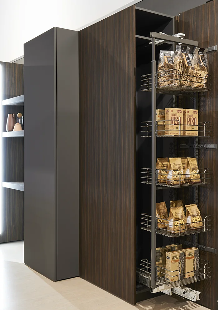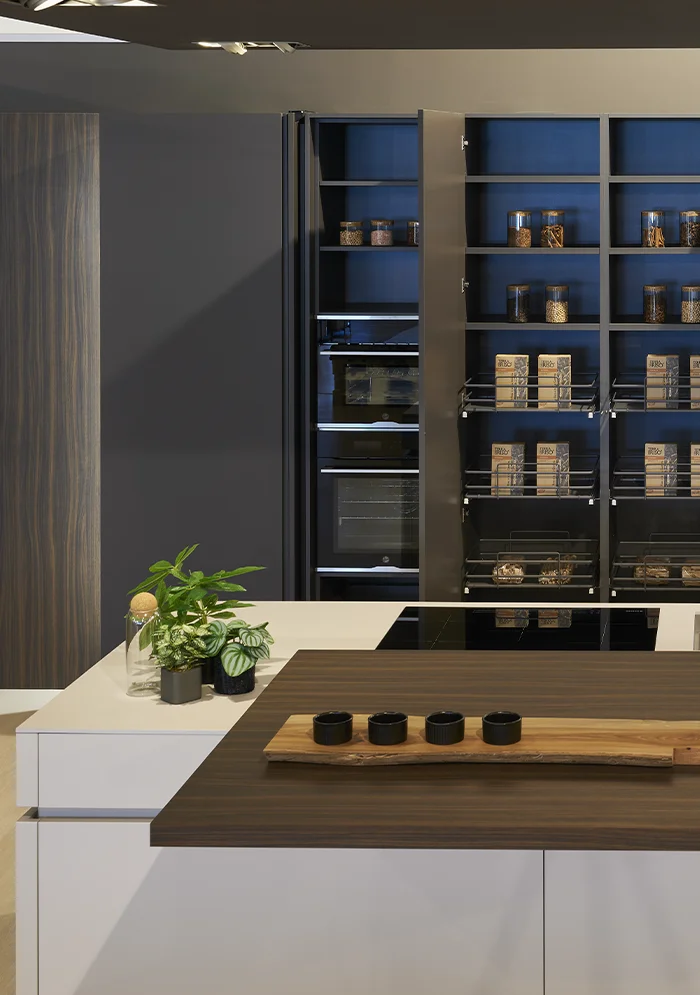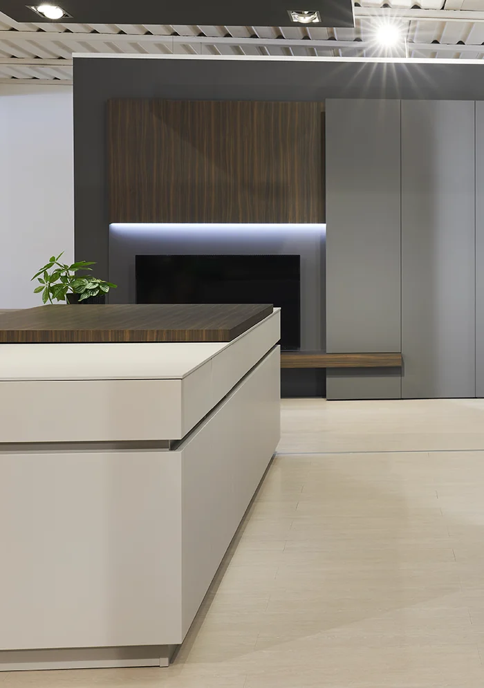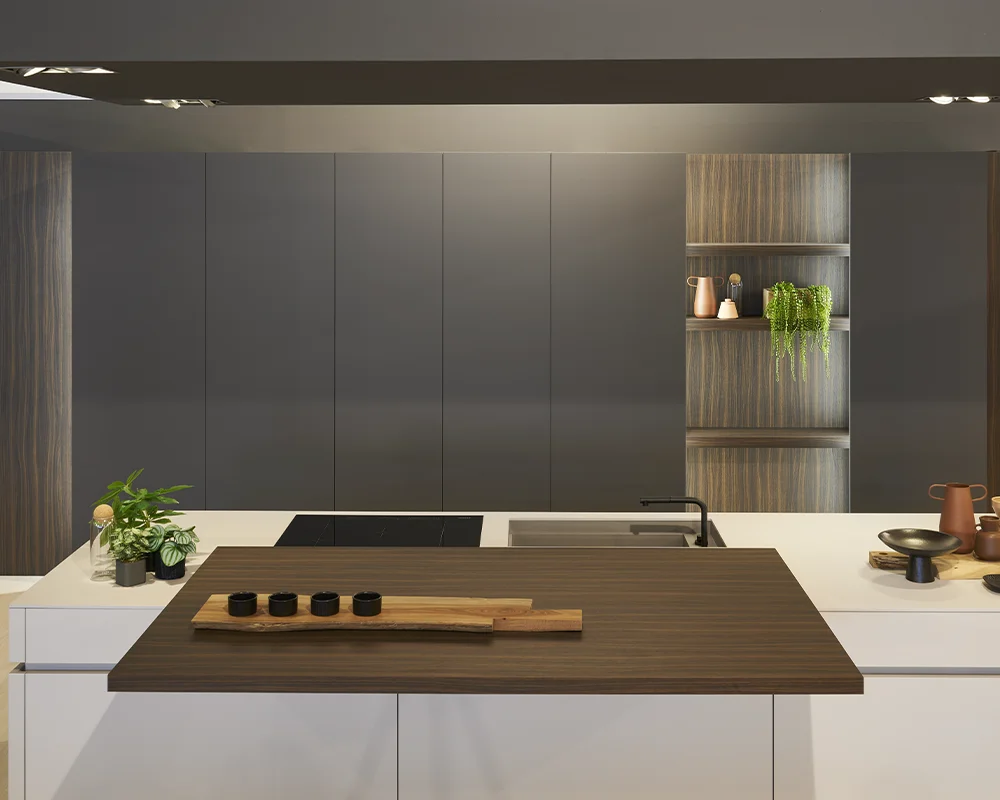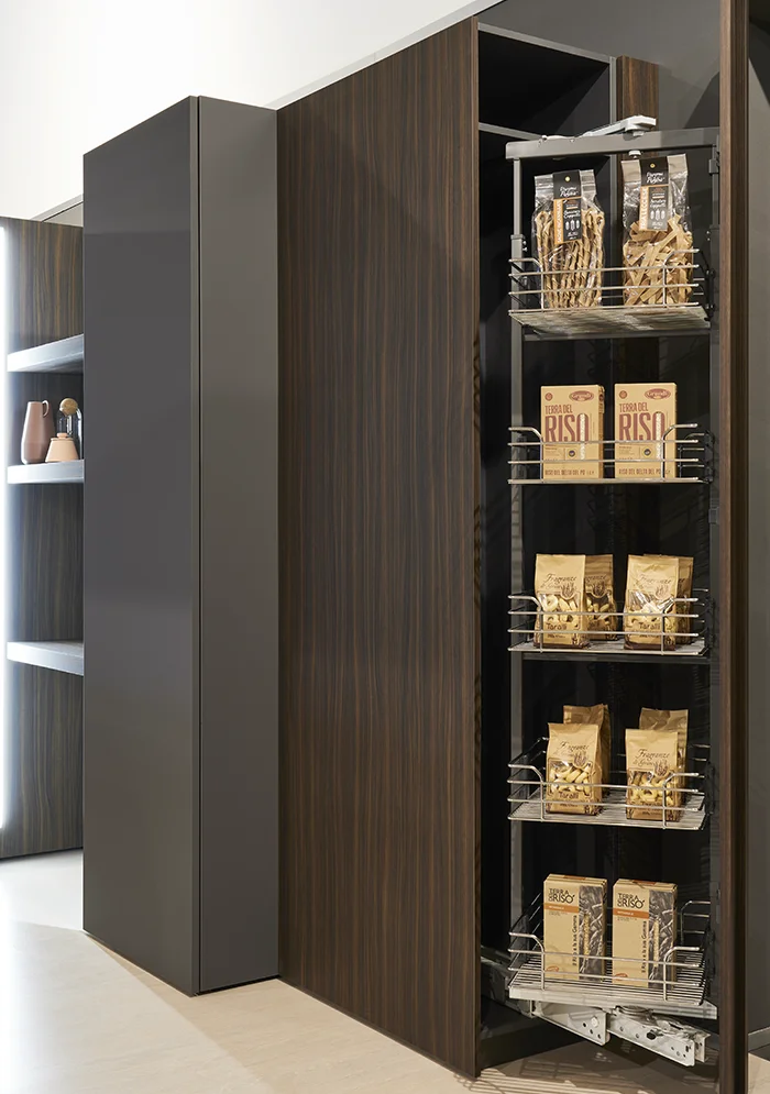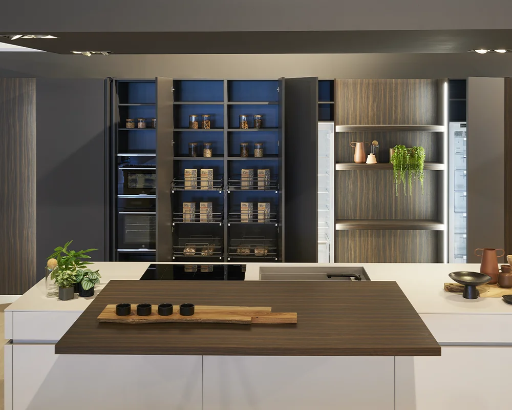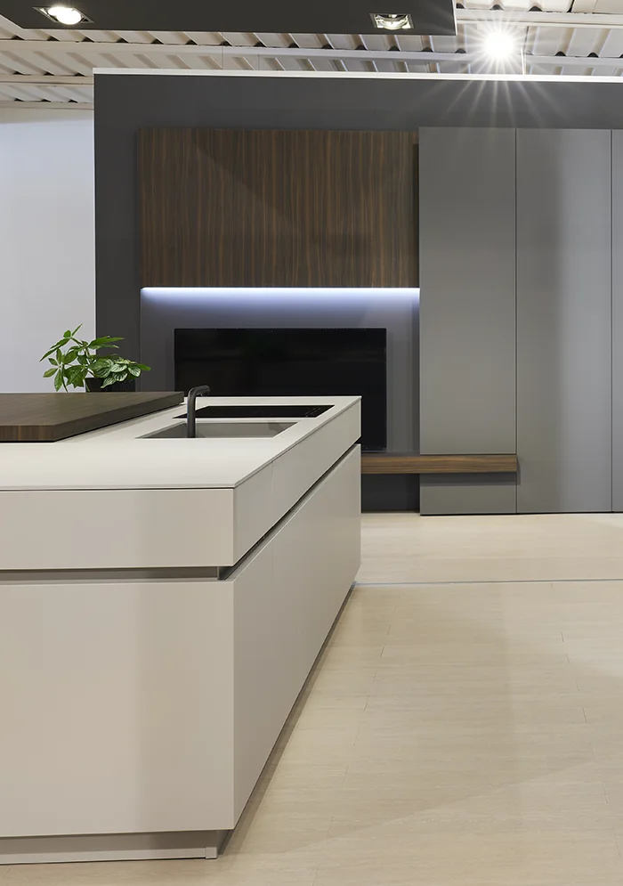 키큰장 전면은 Kashmir lacquer Piombo finish로 마감되어 고급스러운 깊이를 더하며, 배경에는 Noce Marcigliana laminate 목재 패널링이 적용되어 따뜻한 질감과 자연스러운 대비를 이룬다. Revego 오프닝 시스템은 사용하지 않을 때 오븐과 전자레인지를 완전히 숨길 수 있어, 공간의 심미적 통일감과 깔끔한 구조미를 유지한다.아일랜드는 Kashmir Efeso finish 전면과 최소 두께의 Fenix Efeso laminate 상판으로 완성된 순수한 모노크롬 형태(monochromatic monolith)가 특징이다. 중앙에는 동일한 컬러의 탈착식 중앙 그루브(removable central groove)가 적용되어 기능성과 디자인의 완벽한 균형을 구현한다.이 구성은 다시 한 번 Noce Marcigliana laminate 소재의 폴딩 카운터탑과 다양한 두께의 선반으로 완성되며, 섬세한 디테일 속에서 기술적 정밀함과 감각적 미학이 공존하는 공간을 만들어낸다.