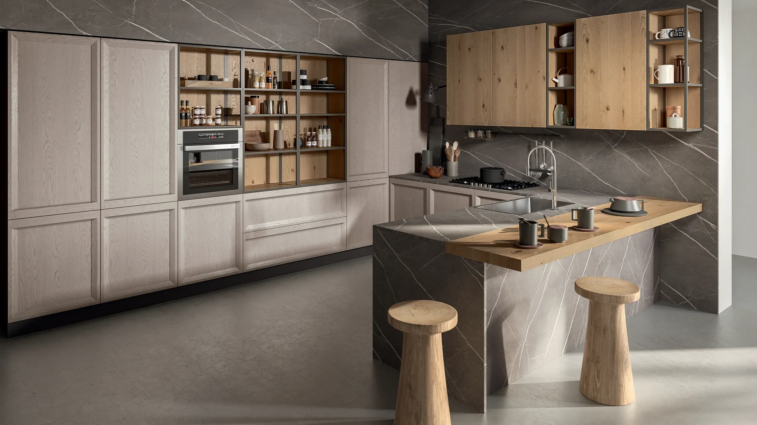 코너 공간에는 도장 처리된 금속 바구니 4개로 구성된 SIGE 350 ME 소프트 클로징 풀아웃 메커니즘이 적용되어 있다. 이 장치는 주방 수납 내부의 구조를 새롭게 정의하며, 다양한 사용 목적에 따라 공간을 효율적이고 편리하게 활용할 수 있게 해준다. 세련된 컬러 톤의 액세서리들은 가구 전반의 자연스러운 소재감과 조화를 이루며, Natural Knotted Oak 상판과 Unicolor edge HPL Akita 상판이 어우러진 우아한 미학을 완성한다.