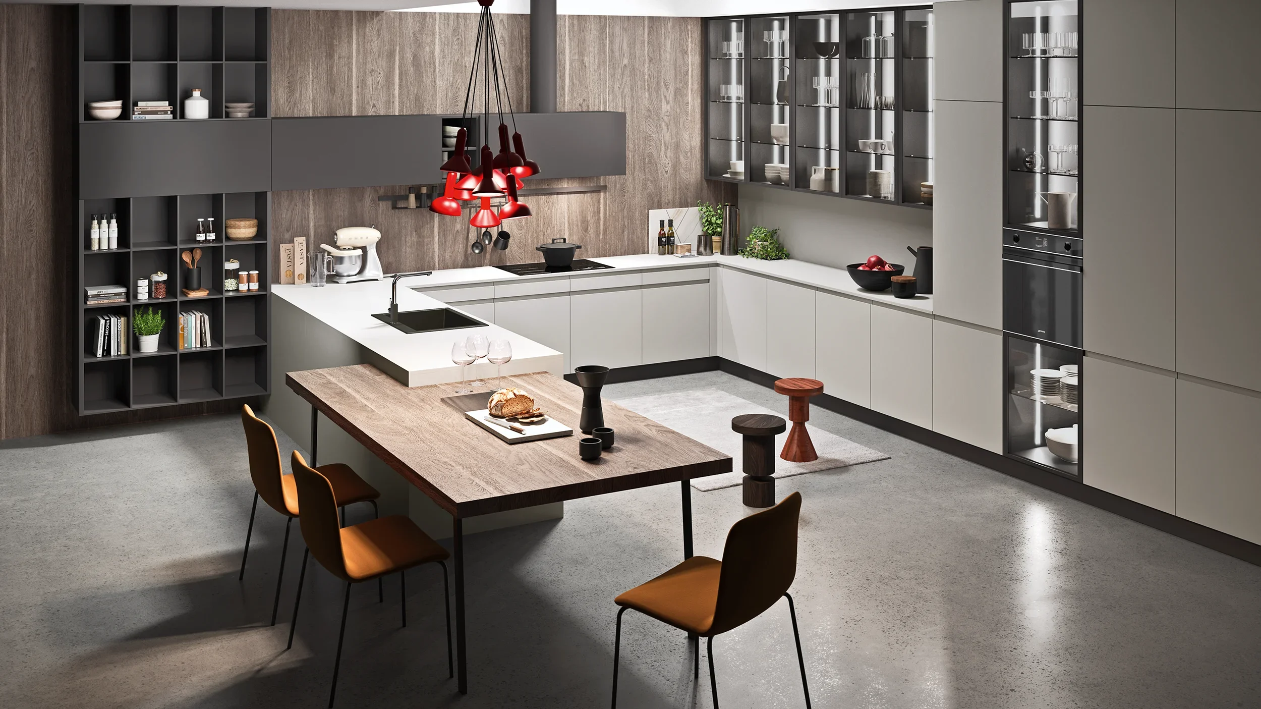 말발굽 형태의 주방은 Efeso와 Metal Grey matt 도장 마감의 도어로 구성되며, 2cm 두께의 Efeso Grey Fenix 상판, Metal Grey Matt XXL 서랍장, 그리고 라미네이트 소재의 스낵 카운터로 완성됩니다. LINE은 기능성과 절제된 미학, 그리고 간결한 디자인 언어가 조화를 이루는 이상적인 키친 컬렉션입니다.