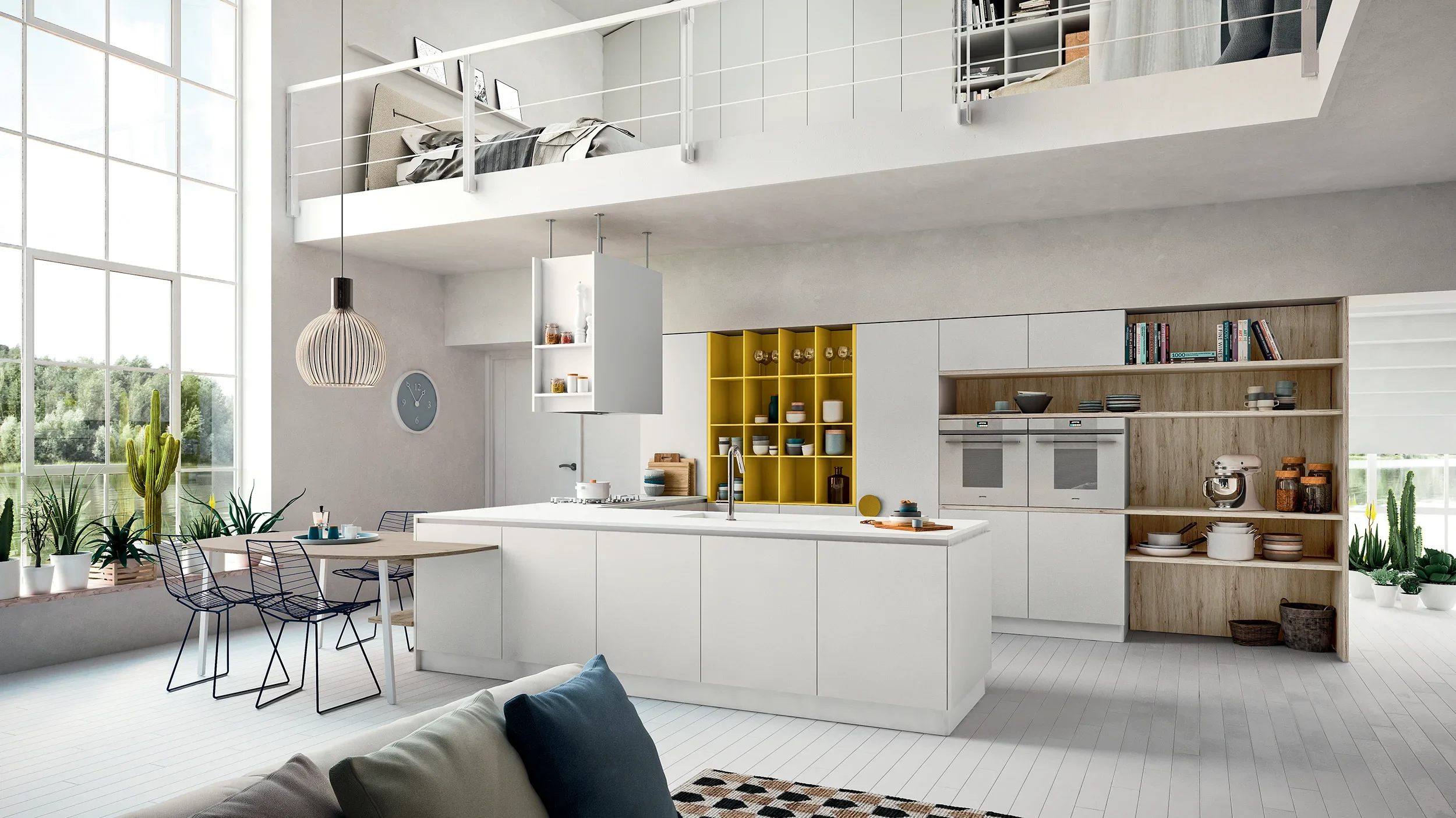조리 공간 위로 길게 이어진 선반은 써모 라미네이트 소재의 구조적 선반으로 확장되어, 공간의 깊이와 연속성을 더합니다.