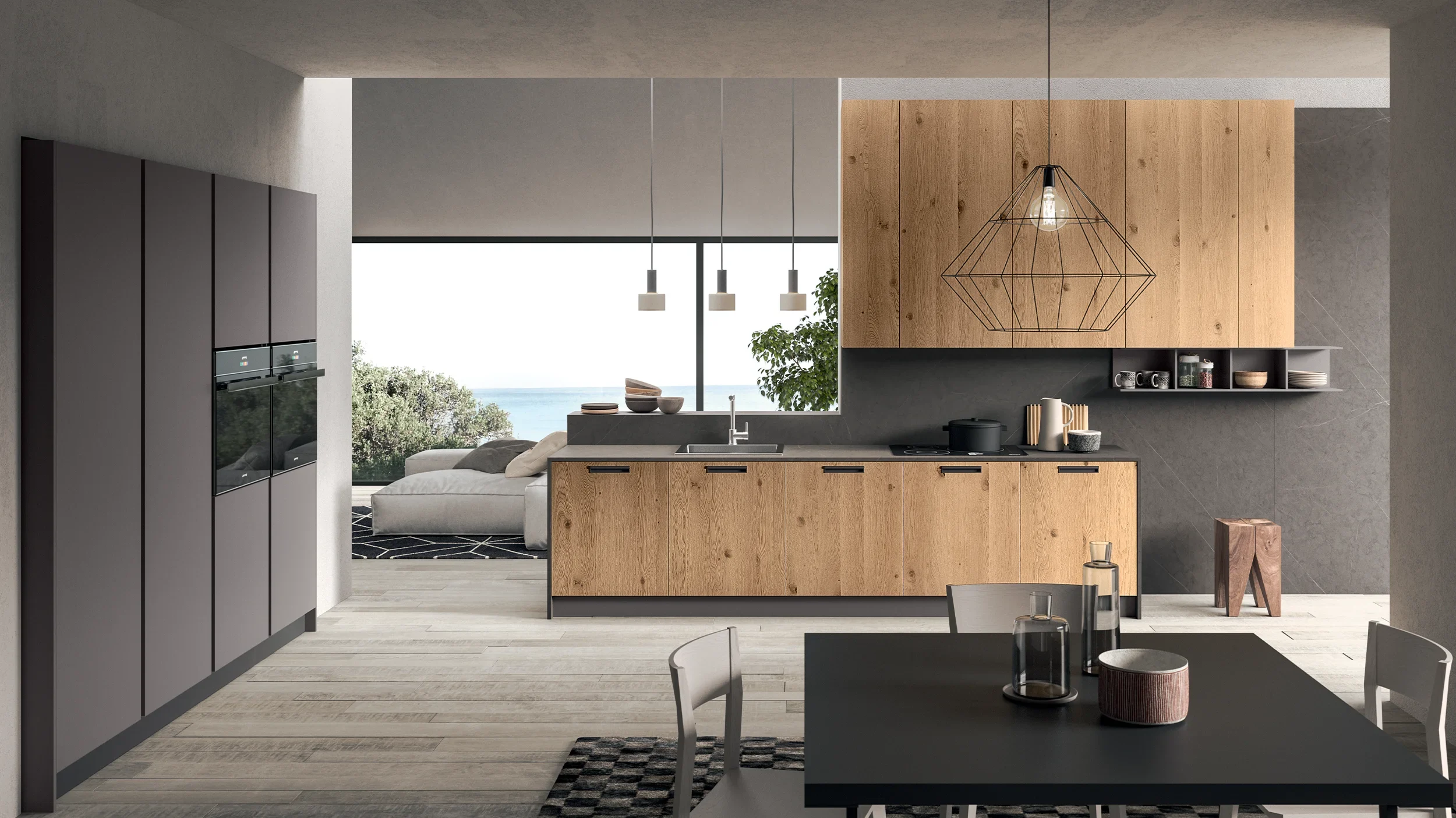 주거 공간에 자연의 감성을 되찾는 흐름은 BRIO 주방의 너도밤나무(너트 오크) 마감 도어에서 가장 잘 드러납니다. 오크 원목 특유의 우아함과 질감이 조화를 이루며, 브러싱 공정을 통해 한층 강조된 촉감과 깊이 있는 표면이 따뜻하고 자연스러운 디자인을 완성합니다. 하부장에는 메탈 그레이 마감의 ‘Accakapa’ 핸들을 적용해 HPL Jamir with Unicolor Unicolor edge 상판과 조화를 이루며, 절제된 감각 속에서 세련된 균형미를 선사합니다.