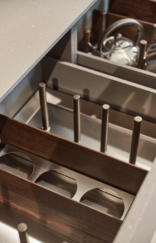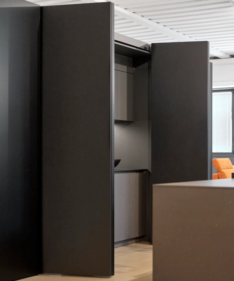 주방의 작업 공간은 간편하게 접근할 수 있으며, 닫을 때는 도어를 가볍게 밀어주기만 해도 전체 공간이 우아하게 숨겨집니다.