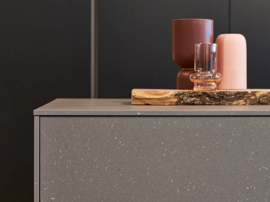 컬럼 전면은 블랙 Krekrelle 래커, 베이스 유닛은 다크 스톤 래커로 마감되었습니다. 상판은 통합형 싱크가 포함된 블랙 스톤 HPL 라미네이트로 구성되어 있습니다.