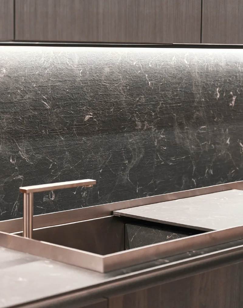 컬럼 전면과 월 유닛은 Metal stainless steel 라미네이트 베이스 유닛은 noir oak 라미네이트로 마감되었다. 워크탑은 empire black HPL 라미네이트로 제작되어 Barazza의 Mizu Kasai 라인의 쿡탑과 싱크를 품고 있다.가장 진보된 디자인은 새로운 미적·기능적 요구를 대변하는 언어가 된다.Mizu Kasai 컬렉션의 싱크는 탁월한 품질과 혁신성으로 돋보이며, Kasai 쿡탑은 싱크와 완벽한 조화를 이루어, 스틸 프레임과 동일한 규격의 외곽선을 유지함으로써 균형 잡히고 조화로운 주방 구성을 완성한다.