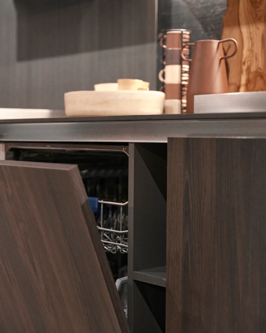 75cm 폭의 도어 전면이 이 주방의 구성을 완성합니다.사용의 편리함과 실용성을 동시에 갖춘 디자인으로, 식기세척기 옆 75cm 모듈에는 세제를 보관할 수 있는 오픈 수납공간이 배치되어 있습니다. 오픈 유닛 내부에는 텐션 구조물이 적용되어 도어를 여닫을 때 전면이 안정적으로 유지되며, 견고하고 정제된 움직임을 제공합니다.