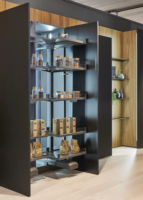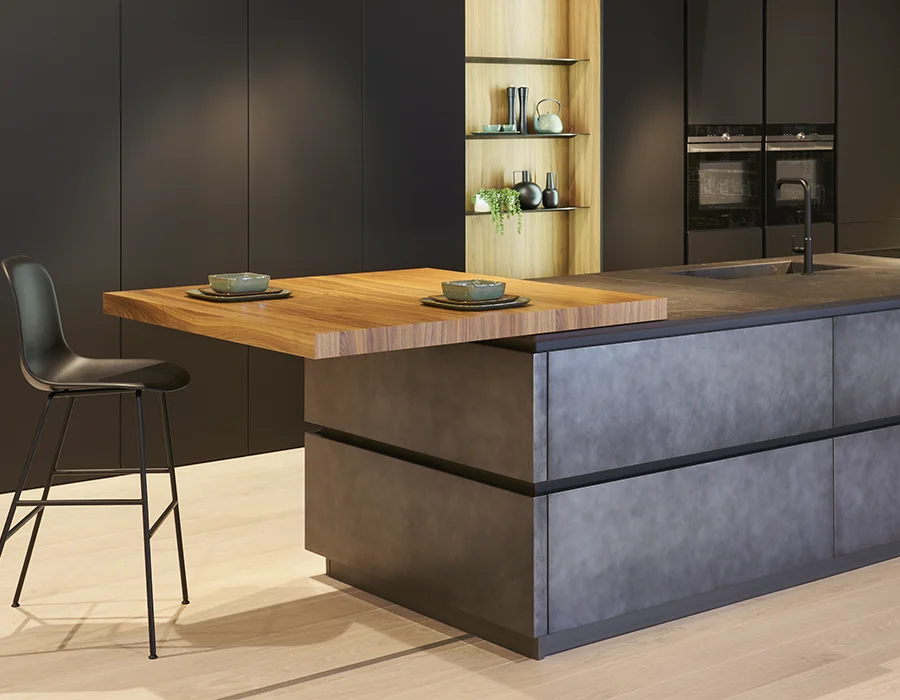 구성을 완성하기 위해 Brianza Walnut veneer 본연의 질감을 살린 sliding folding countertop을 추가했습니다. 이는 필요에 따라 작업 공간을 확장할 수 있는 유연한 디자인 솔루션으로, 아일랜드 상부에 손쉽게 추가 작업면을 형성할 수 있도록 설계되었습니다.하부 메커니즘은 Made in Italy의 정교한 기술로 제작된 강화 알루미늄 가이드 시스템을 기반으로 합니다. 이 구조는 직선 및 대각선 방향 모두에서 부드럽고 안정적인 슬라이딩을 보장하며, 내부에 숨겨진 고강도 부품 덕분에 높은 하중에도 견딜 수 있는 내구성과 견고함을 자랑합니다.이로써 공간은 필요에 따라 형태를 바꾸며, 디자인과 기능이 완벽히 조화를 이루는 유연한 주방으로 완성됩니다.