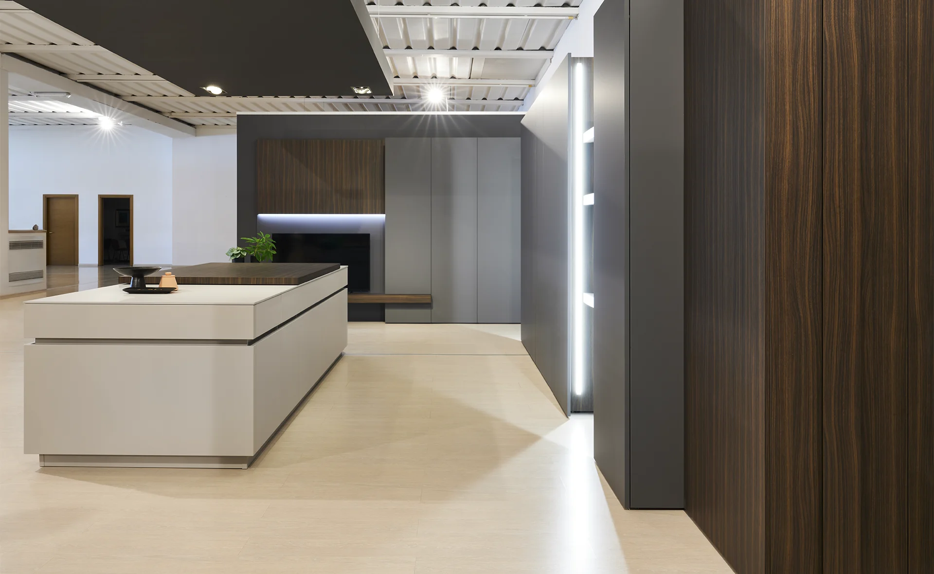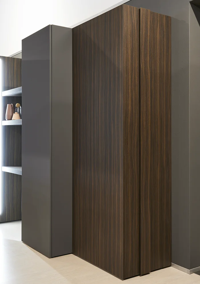 키큰장 전면은 Kashmir lacquer Piombo finish로 마감되어 고급스러운 깊이를 더하며, 배경에는 Noce Marcigliana laminate 목재 패널링이 적용되어 따뜻한 질감과 자연스러운 대비를 이룬다. Revego 오프닝 시스템은 사용하지 않을 때 오븐과 전자레인지를 완전히 숨길 수 있어, 공간의 심미적 통일감과 깔끔한 구조미를 유지한다.아일랜드는 Kashmir Efeso finish 전면과 최소 두께의 Fenix Efeso laminate 상판으로 완성된 순수한 모노크롬 형태(monochromatic monolith)가 특징이다. 중앙에는 동일한 컬러의 탈착식 중앙 그루브(removable central groove)가 적용되어 기능성과 디자인의 완벽한 균형을 구현한다.이 구성은 다시 한 번 Noce Marcigliana laminate 소재의 폴딩 카운터탑과 다양한 두께의 선반으로 완성되며, 섬세한 디테일 속에서 기술적 정밀함과 감각적 미학이 공존하는 공간을 만들어낸다.